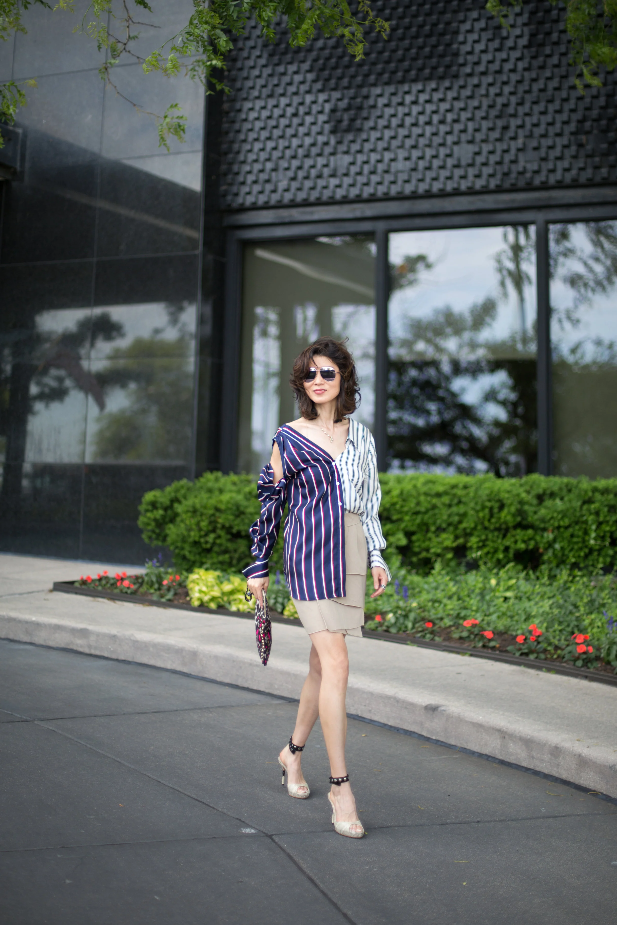 When it comes to outfit shopping, my principle has always been "buy less, choose well". When I first saw this Monse silk blouse, I knew I had to get it the moment it was on sale. It’s a two-tone silk blouse in mixed stripe featuring optional off the shoulder details, and has a very relaxed fit. The combination of stripe and silk are just fantastic. It’s a timeless piece that I can image myself in during my 60’s. I styled it with a 3.1 Philip Lim khaki skirt. It also goes very nicely with silk wide leg pants. I picked a natural snakeskin sandal instead of red or blue pumps. To me those coordinate color pumps are a little too heavy for this timeless piece. I am so obsessed with the ankle cuffs. I used two removable studs ankle cuffs from my other shoes to add some does of edgy. Be creative with your shoes! The same shirt is sold full price at a few department stores (sakes, Nordstrom). Hurry to order from net-a-porter.com before it’s sold out. One thing I can assure you that this is a very stylish staple to wear through the years. Photos By: Roxy Yang www.roxyyang.com