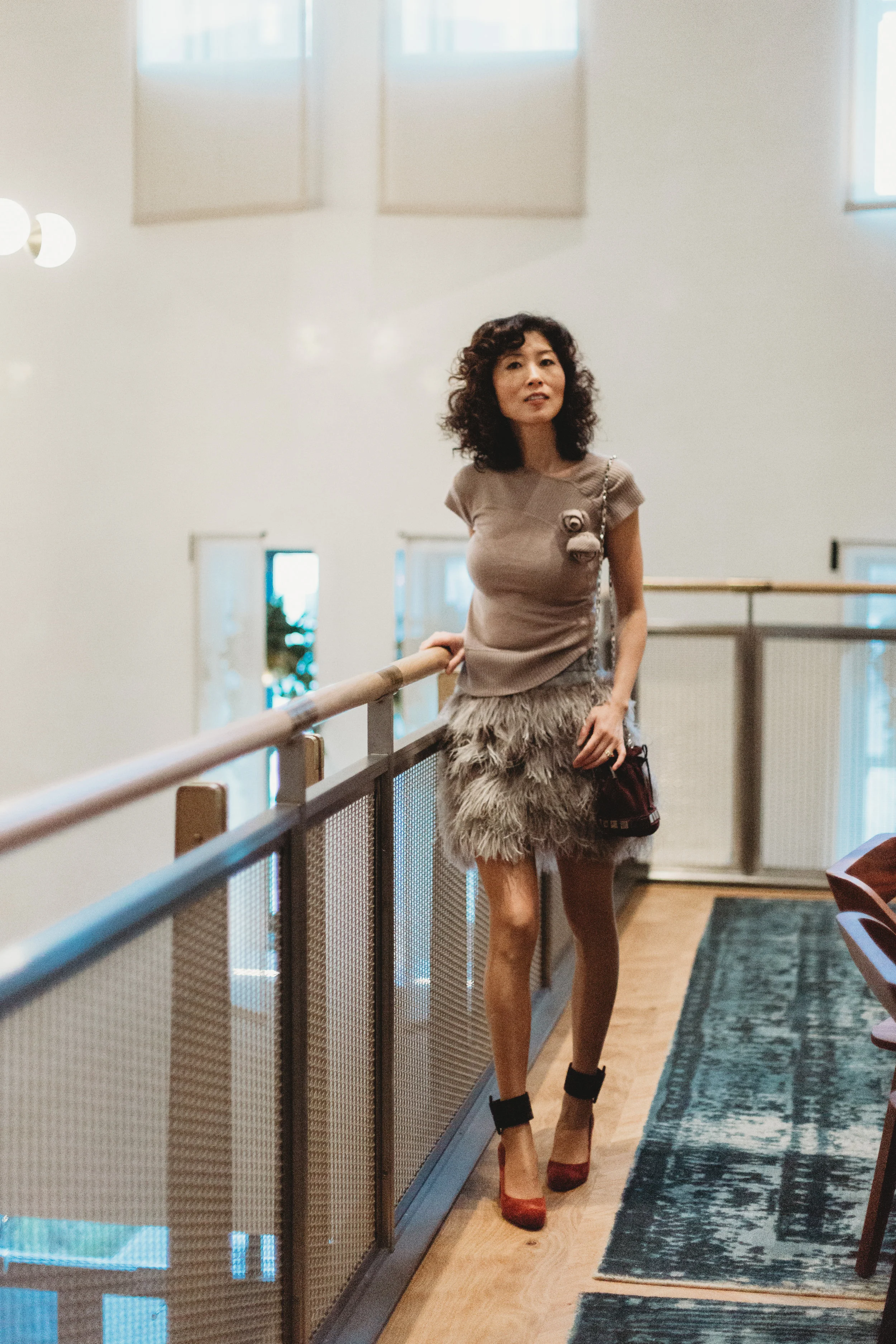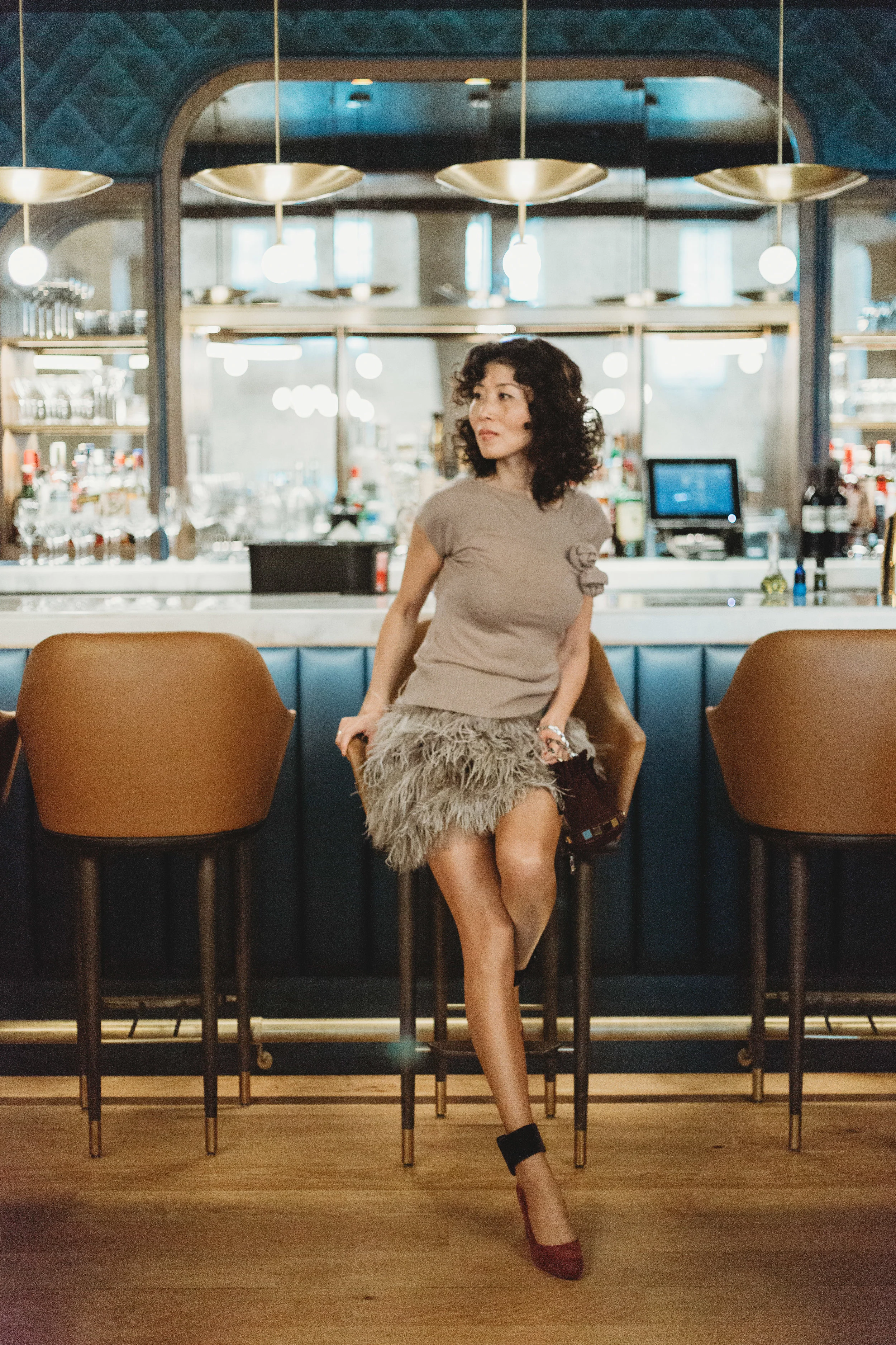 I am wearing: Maxmara wool blazer, Maxmara cashmere top, Burnello Cucinelli feather skirt, Cole Haan Pumps, Attico ankle straps, Tomasini mini purse, Gucci Belt.